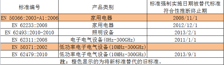 根據(jù)歐洲電工標(biāo)準(zhǔn)委員會(CENELEC)的決定,關(guān)于涉及人體電磁場環(huán)境(EMF)的標(biāo)準(zhǔn)EN 62233:2008與人體輻射有關(guān)的家用和類似用途設(shè)備的電磁場測量方法,IEC62233:2005的修訂版)于2008年12月1日起在CENELEC 30個成員國內(nèi)正式實施,標(biāo)準(zhǔn)EN 50366:2003將于2012年12月1日廢止。